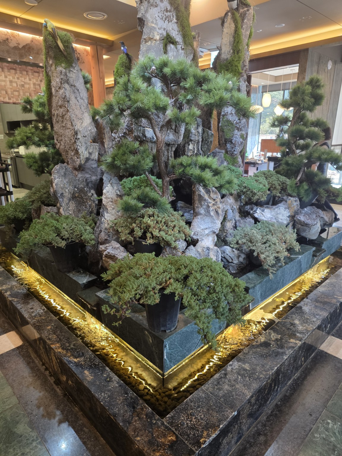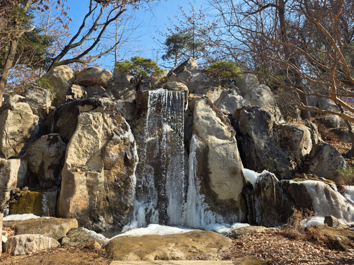 돌 조형물이 먼저 시선을 잡고, 폭포가 흐르는 소리가 공간을 채운다.