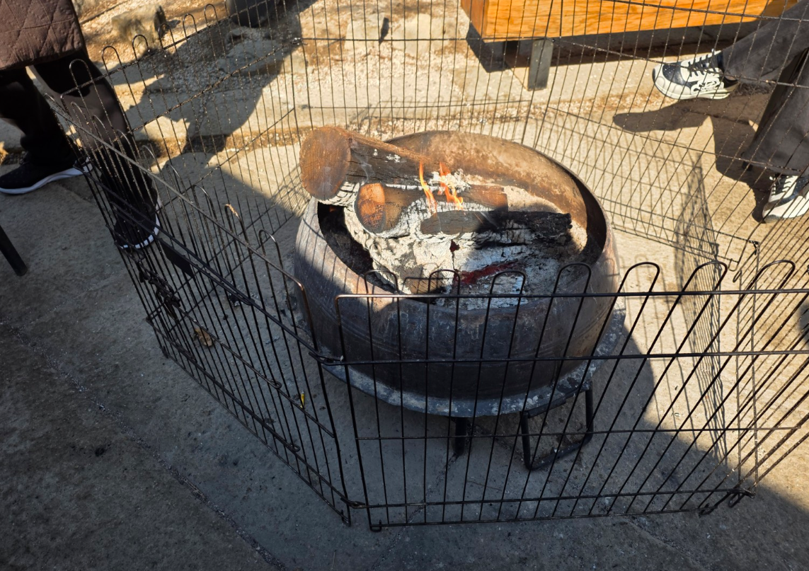 추울까 봐 커다란 검정 솥에 장작을 넣어